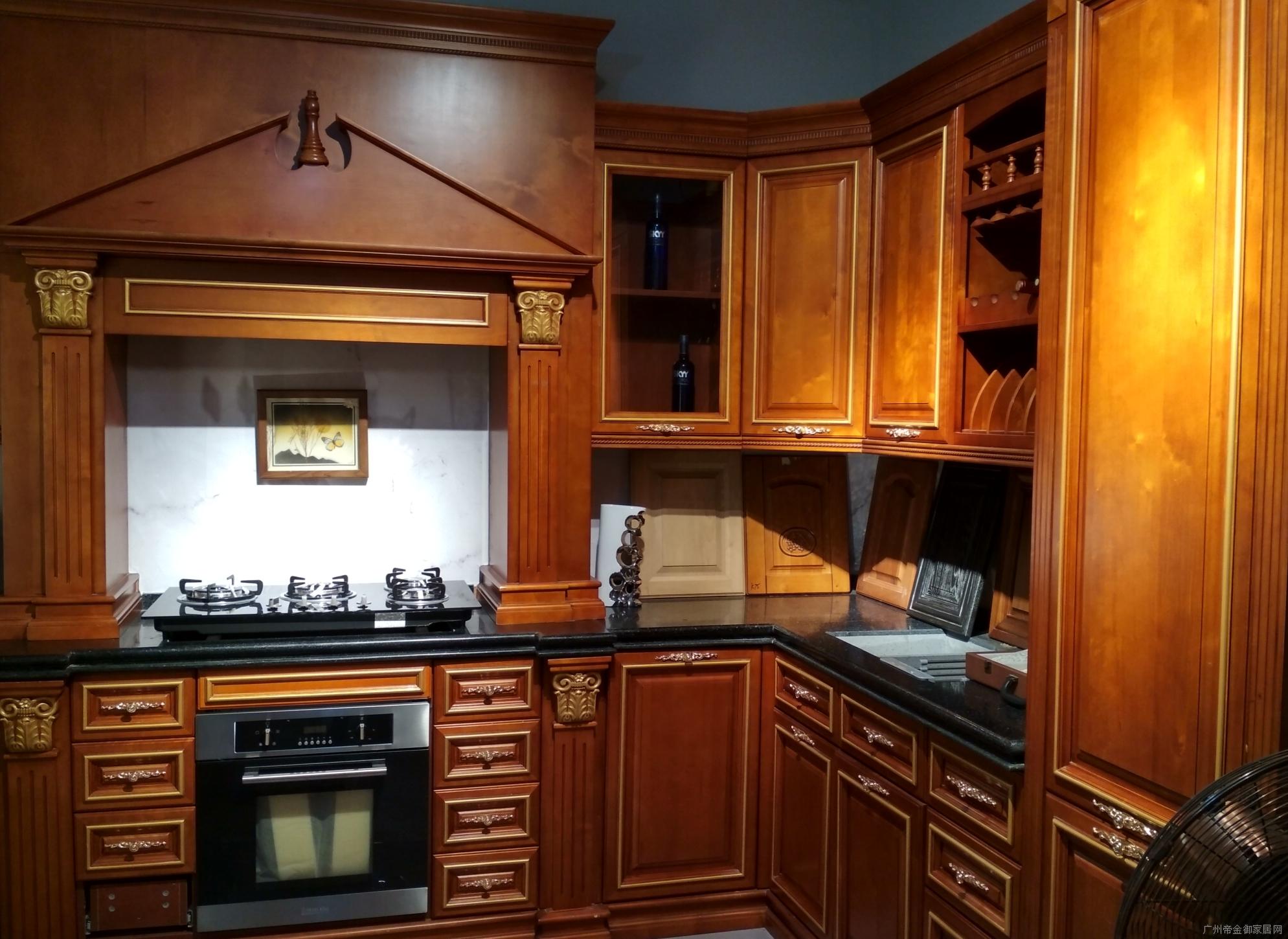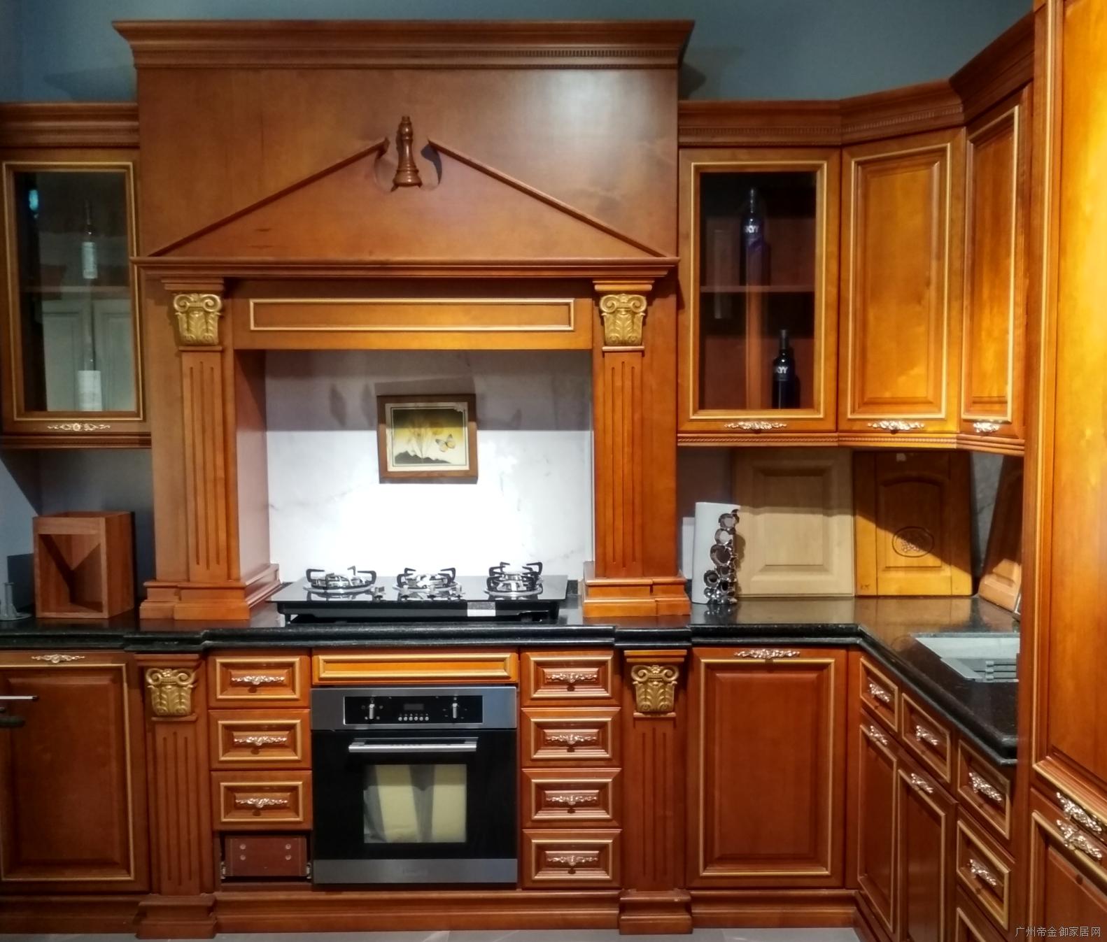 地柜安置了多個緩沖抽屜,可放置一些刀具類和一些不常用的物品,拉手也精挑細選,選擇了金色仿古型拉手,則臺面選擇鉑金黑色石英石,黑色的石英石是較少人選擇的,也只有這款極具歐美風格的實木櫥柜才能自然搭配,打造不一樣的風格,更具傳統感。