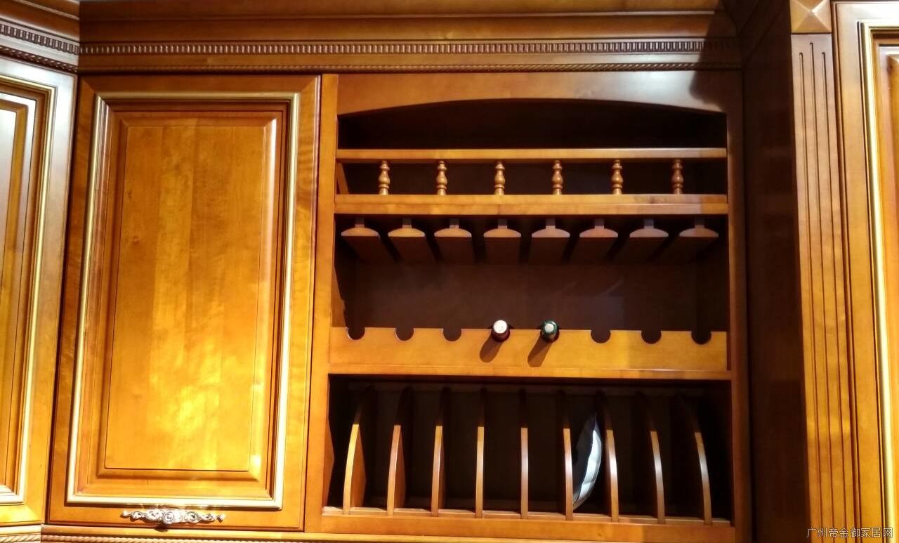 櫥柜右方安置原木紅酒架 ,使紅酒平整置放,保持了紅酒的特性,酒架分上中下三層,上層和中層可放置紅酒,下層則放置碗盤方便拿取。
